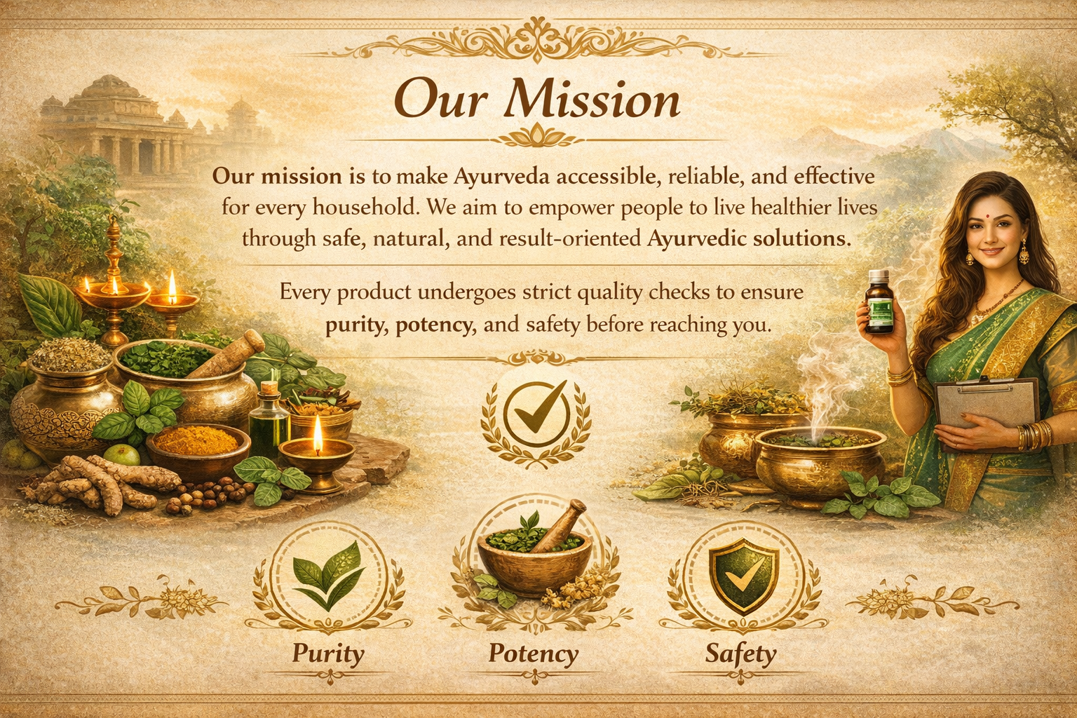 Our mission is to make Ayurveda accessible, reliable, and effective for every household. We aim to empower people to live healthier lives through safe, natural, and result-oriented Ayurvedic solutions.